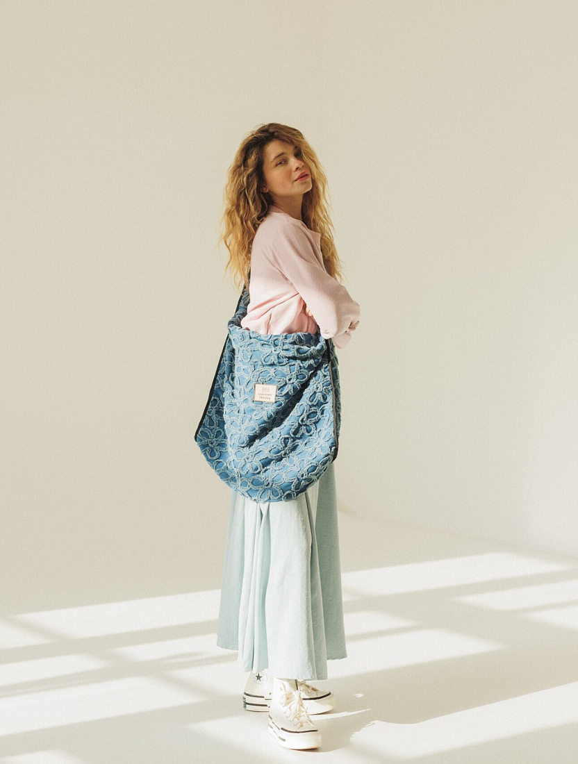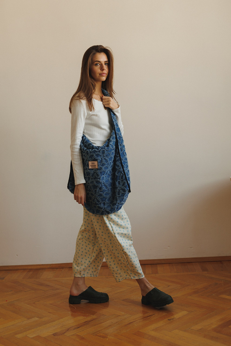 Широкий плечевой ремень, вместительное основное отделение на молнии, внутренний небольшой кармашек тоже на молнии.