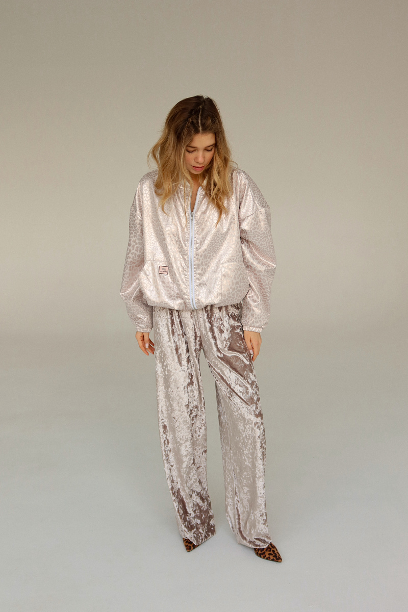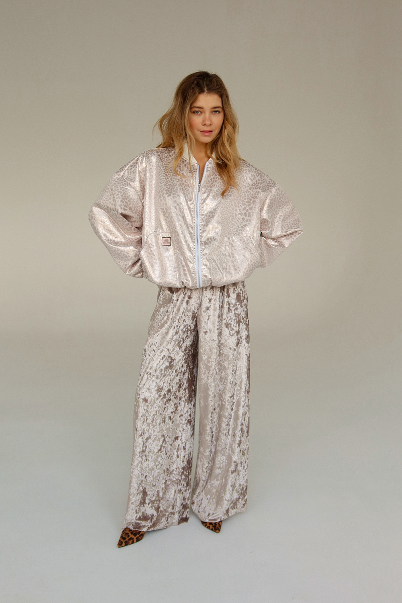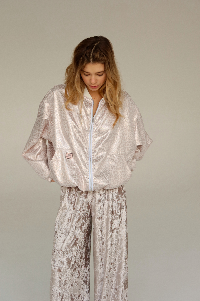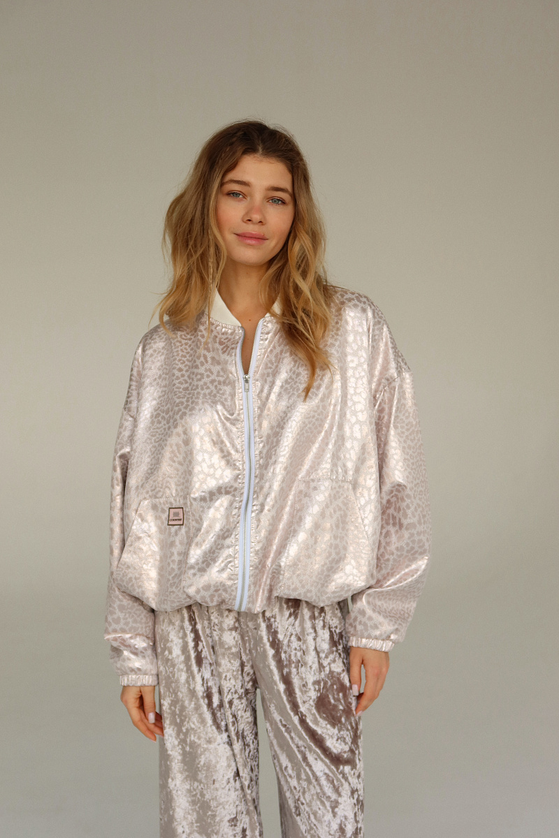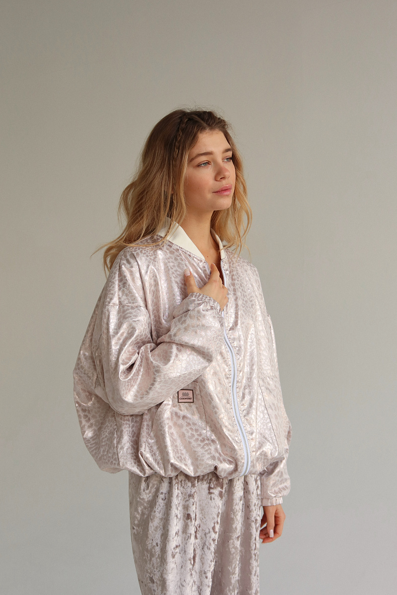 Бомбер выполнен из блестящего жаккарда с рибаной на манжетах и горловине. Внизу затяжка-резинка.