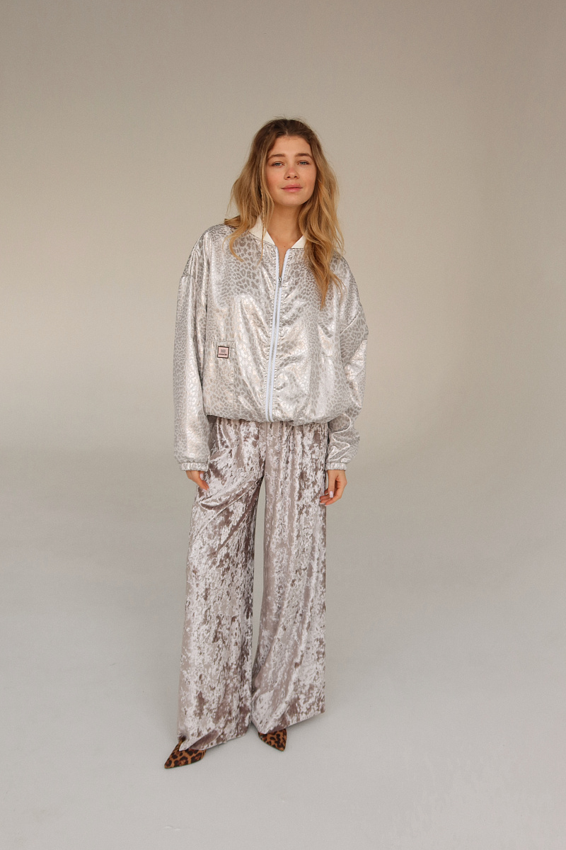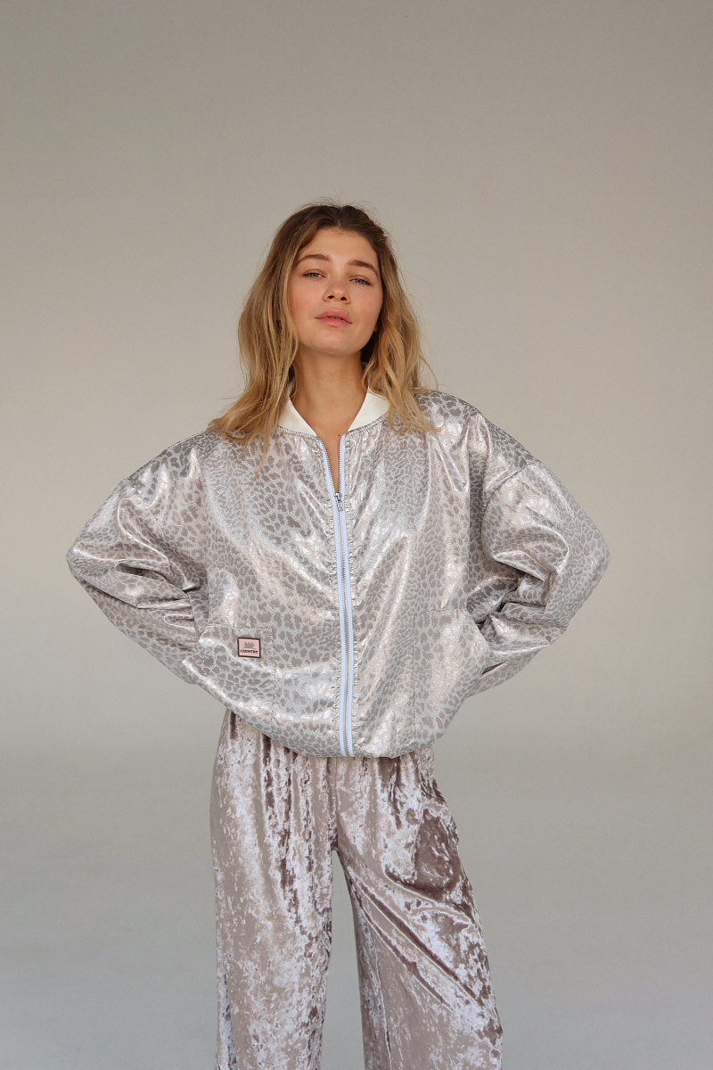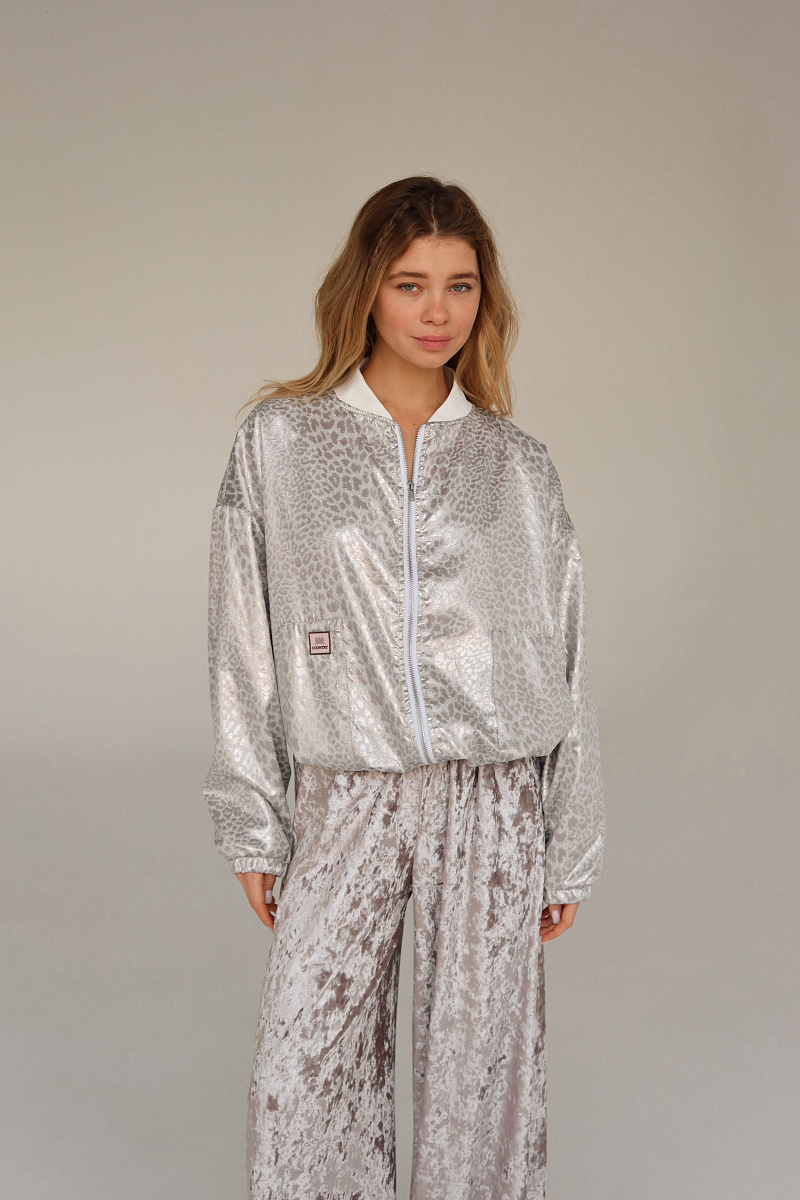 Бомбер выполнен из блестящего жаккарда с рибаной на манжетах и горловине. Внизу затяжка-резинка.