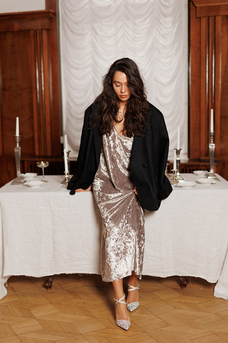 Воплощение тихой, зрелой элегантности: прямой удлинённый силуэт мягко скользит по фигуре, а бархат с его переливами делает образ еще более роскошным.