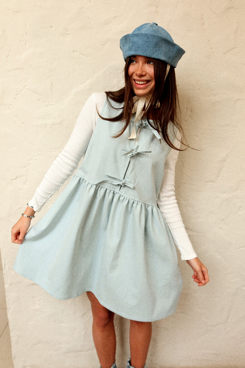 Сарафан Grange — немного наивный, но с характером. Он не требует особого повода: его можно носить с лонгсливом, плотными колготами и грубыми ботинками или оставить самостоятельным элементом гардероба.