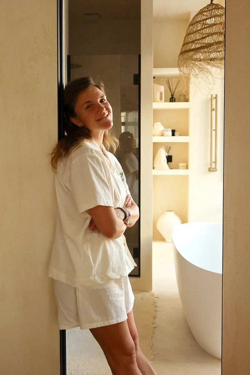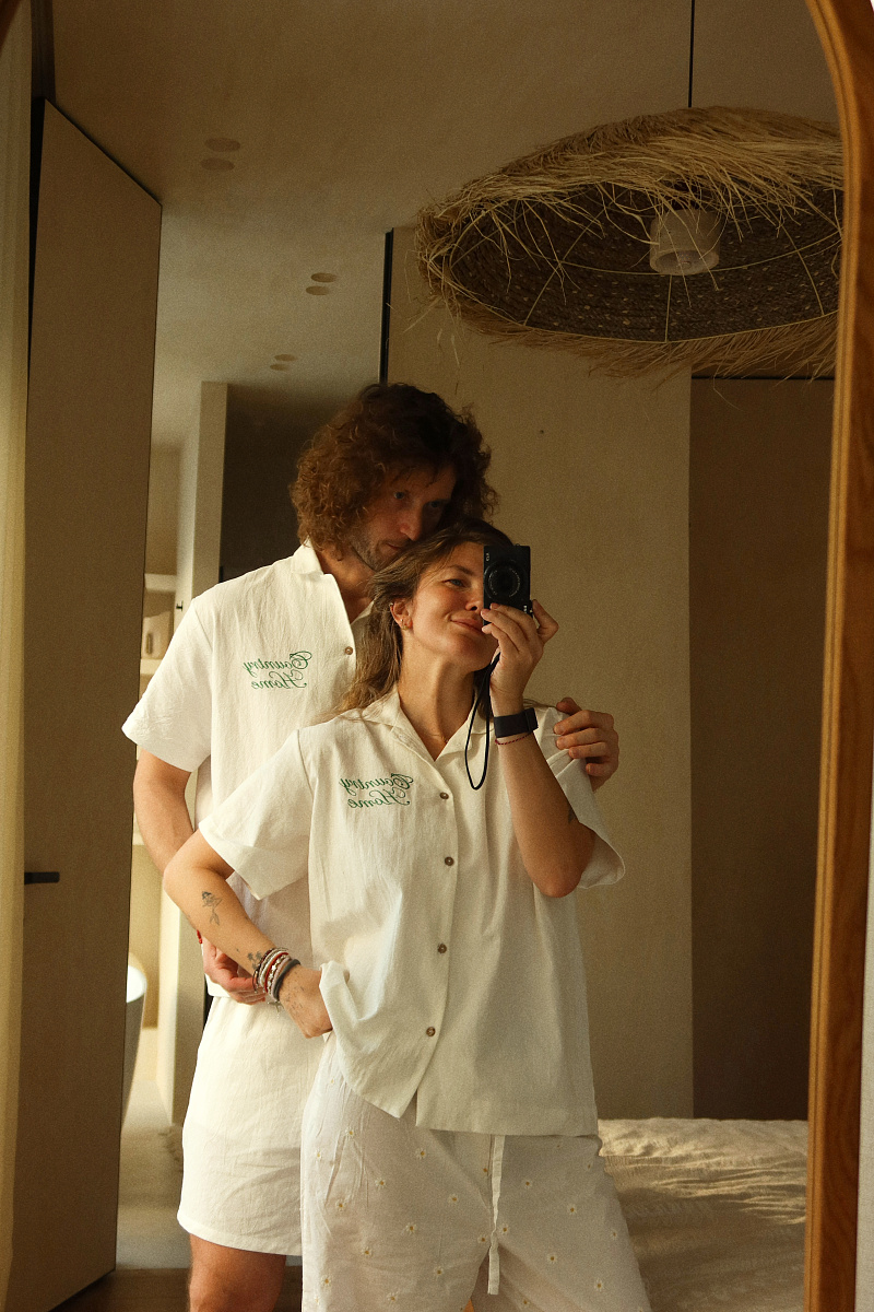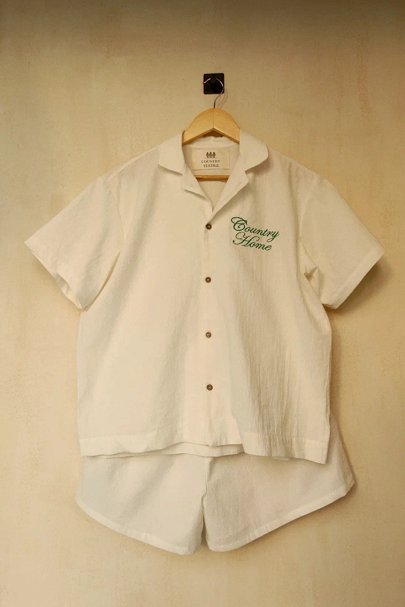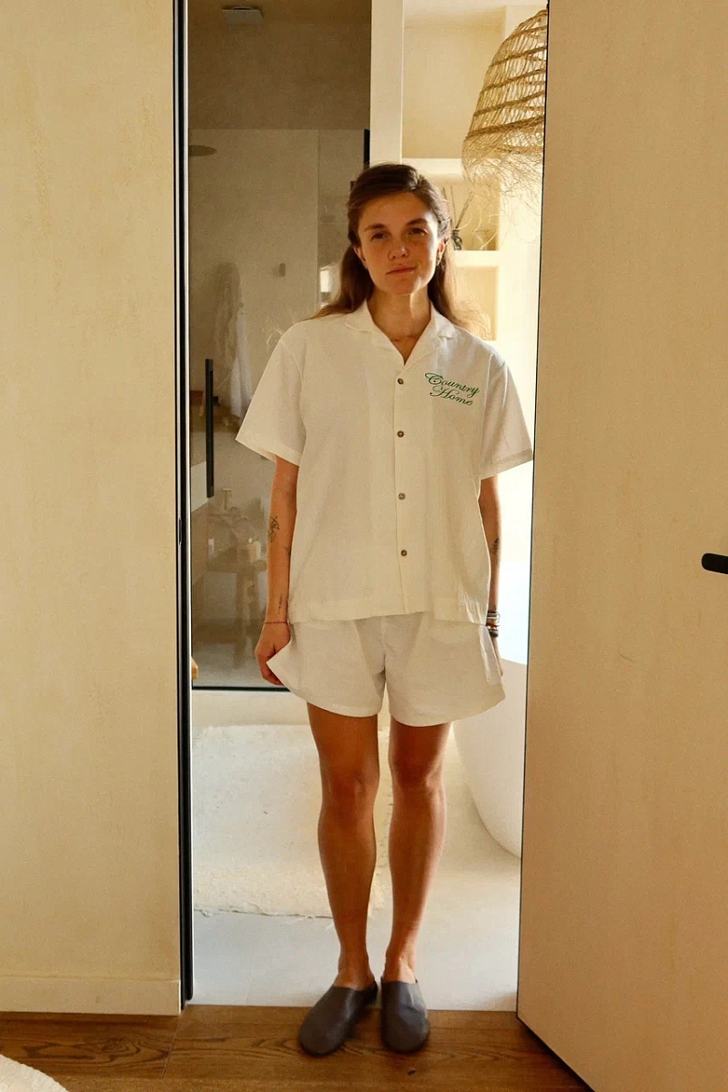 Оверсайз рубашка с шортами натурального цвета из 100% хлопка. Классический воротник и застежка на пуговицы.