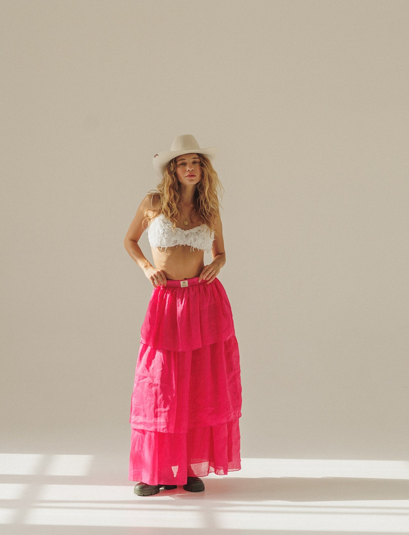 Летящая юбка Фламинго в насыщенном оттенке фуксия с воздушными многоярусными воланами сразу притягивает все взгляды.