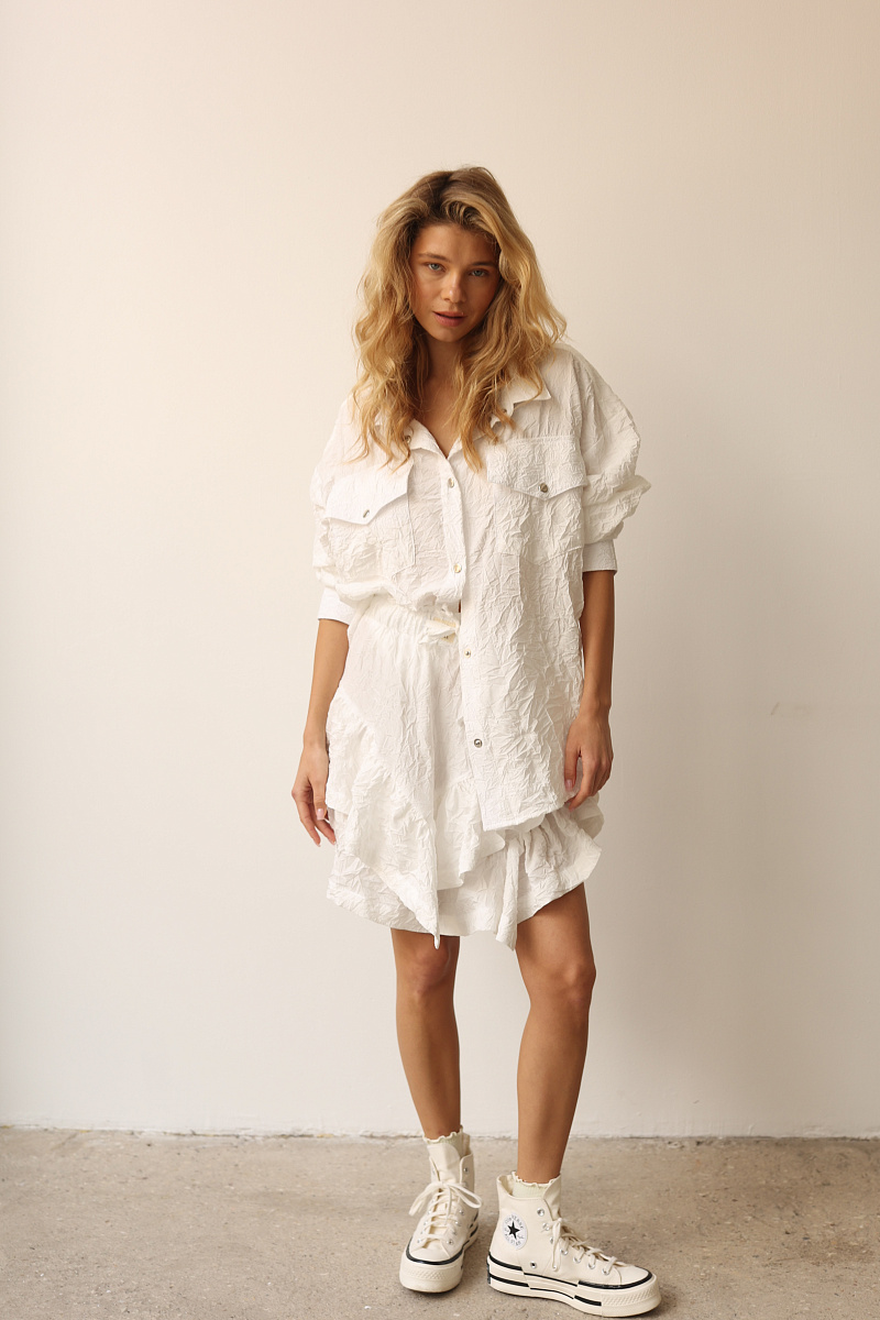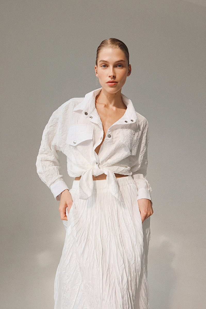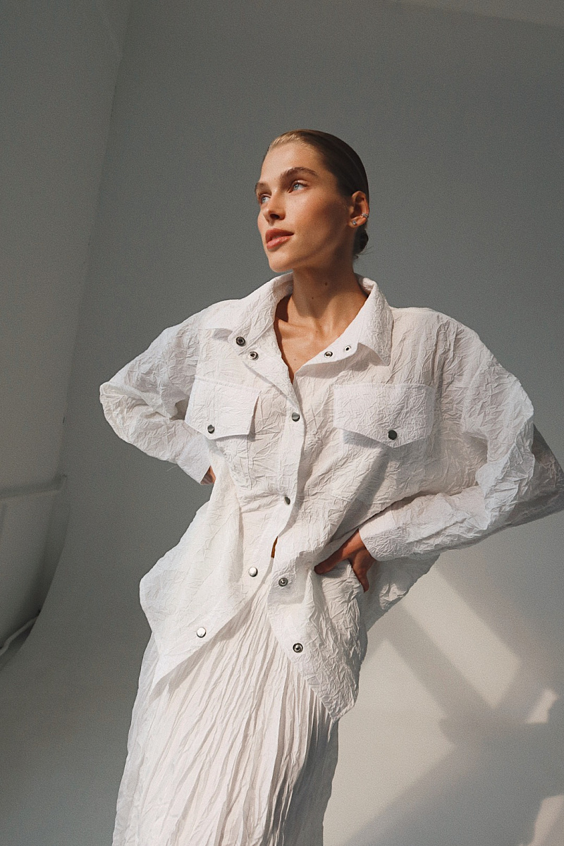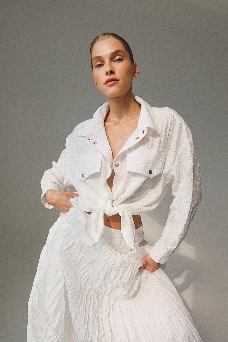 На модели изделия из белого жатого хлопка и ришелье ромбы