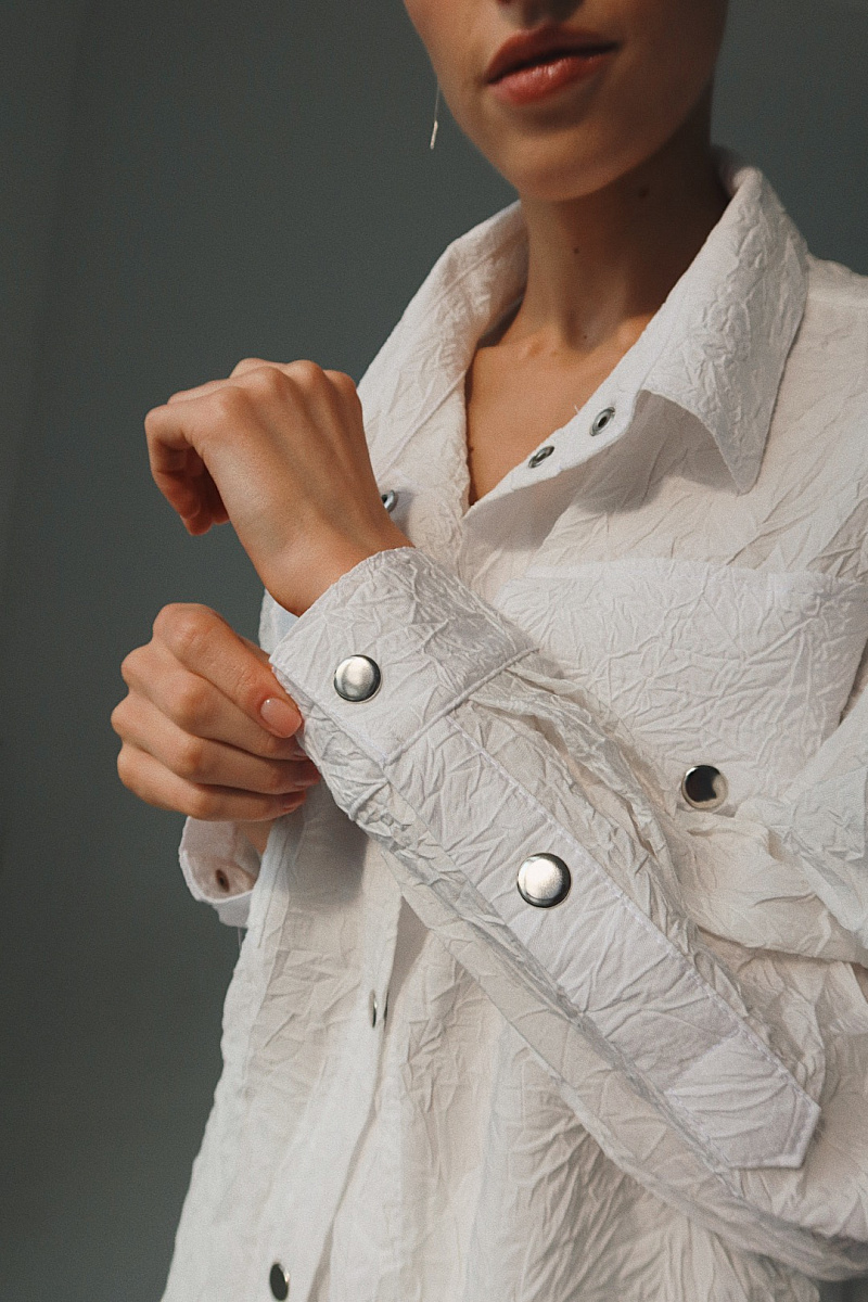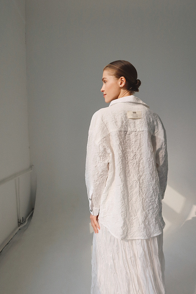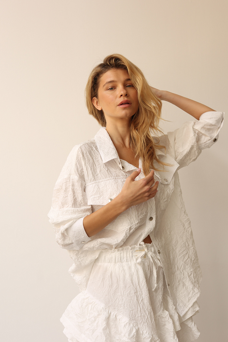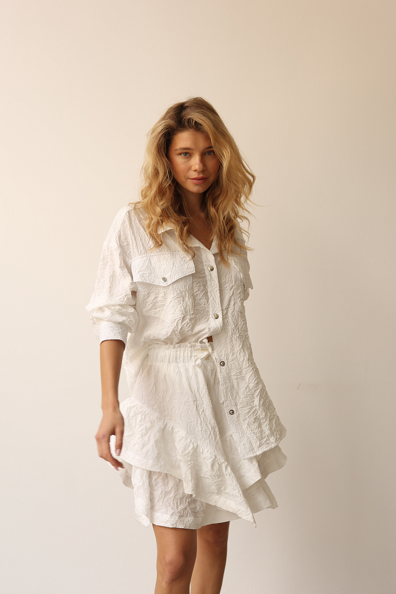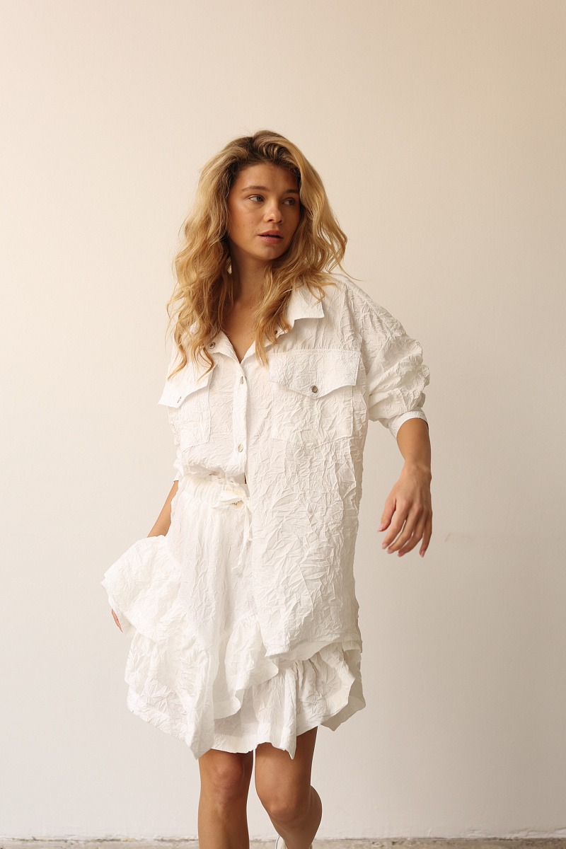 На модели изделия из белого жатого хлопка и ришелье ромбы