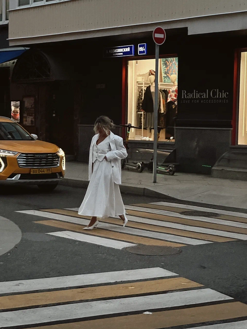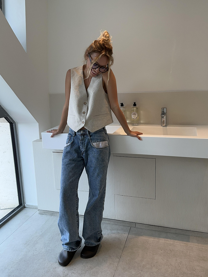 На модели изделие изо льна в цвете "натуральный".