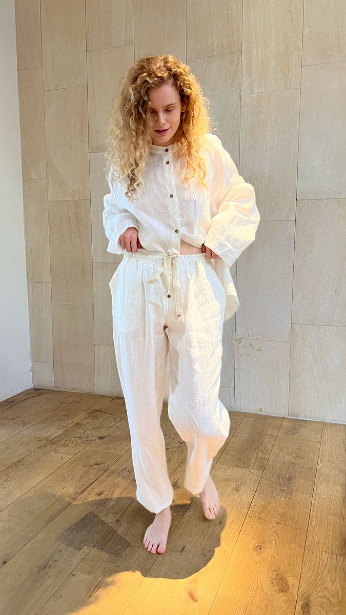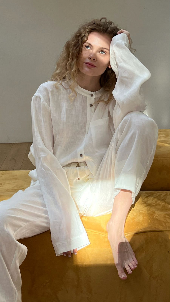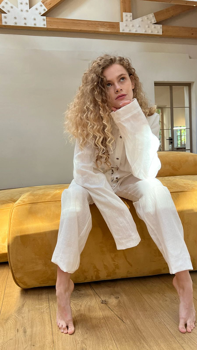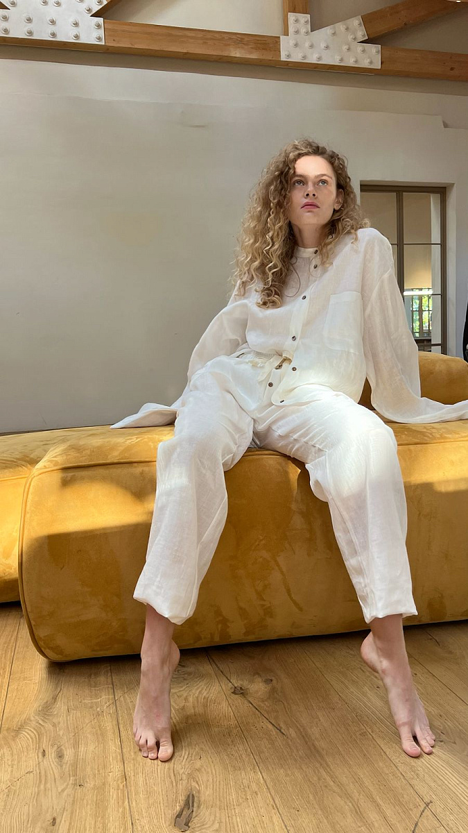 На модели изделие из белого льна.