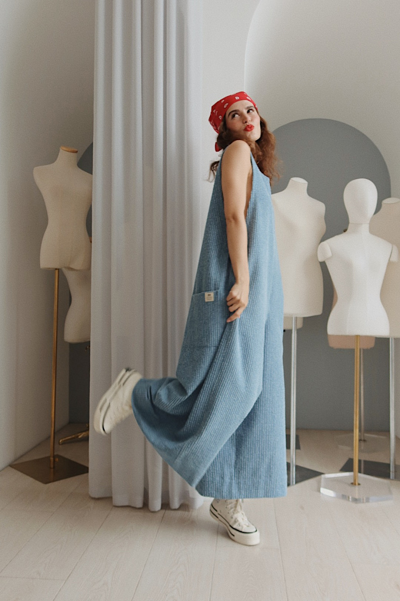 На моделях изделие изо льна в оттенке Небесный .