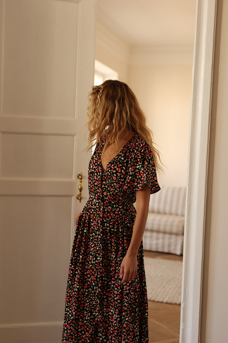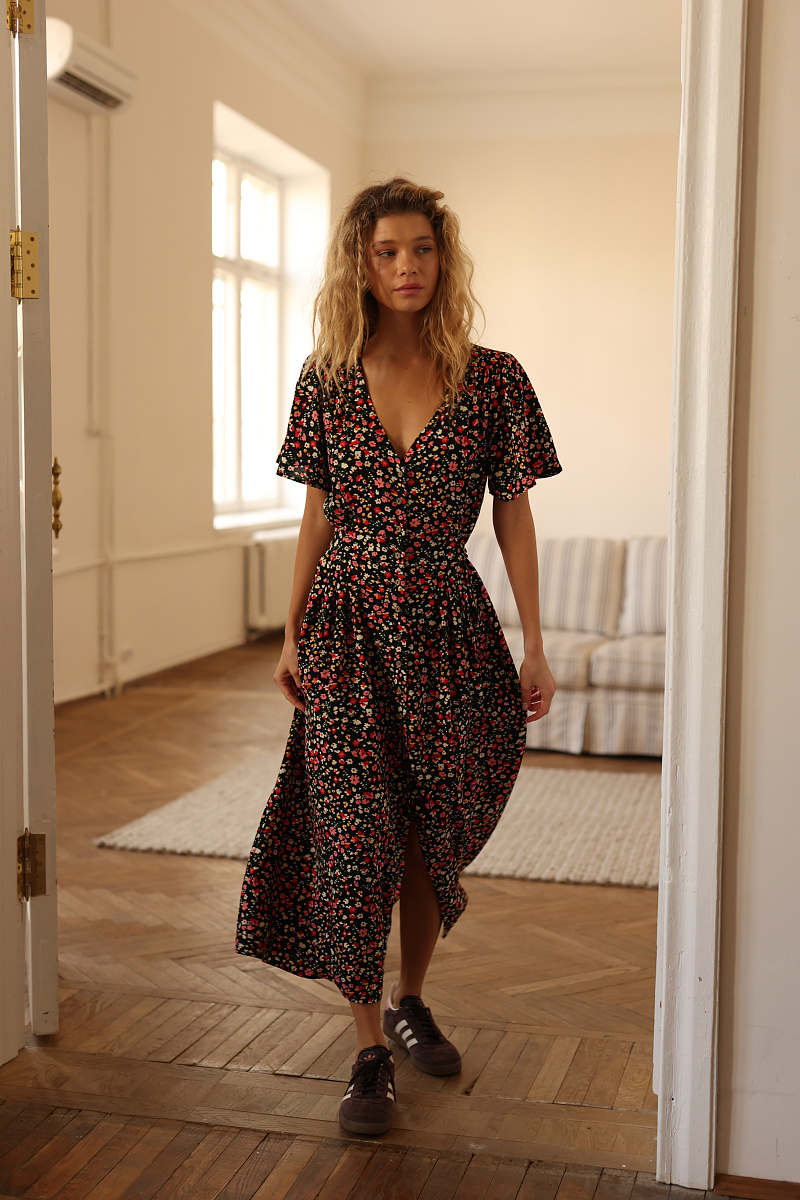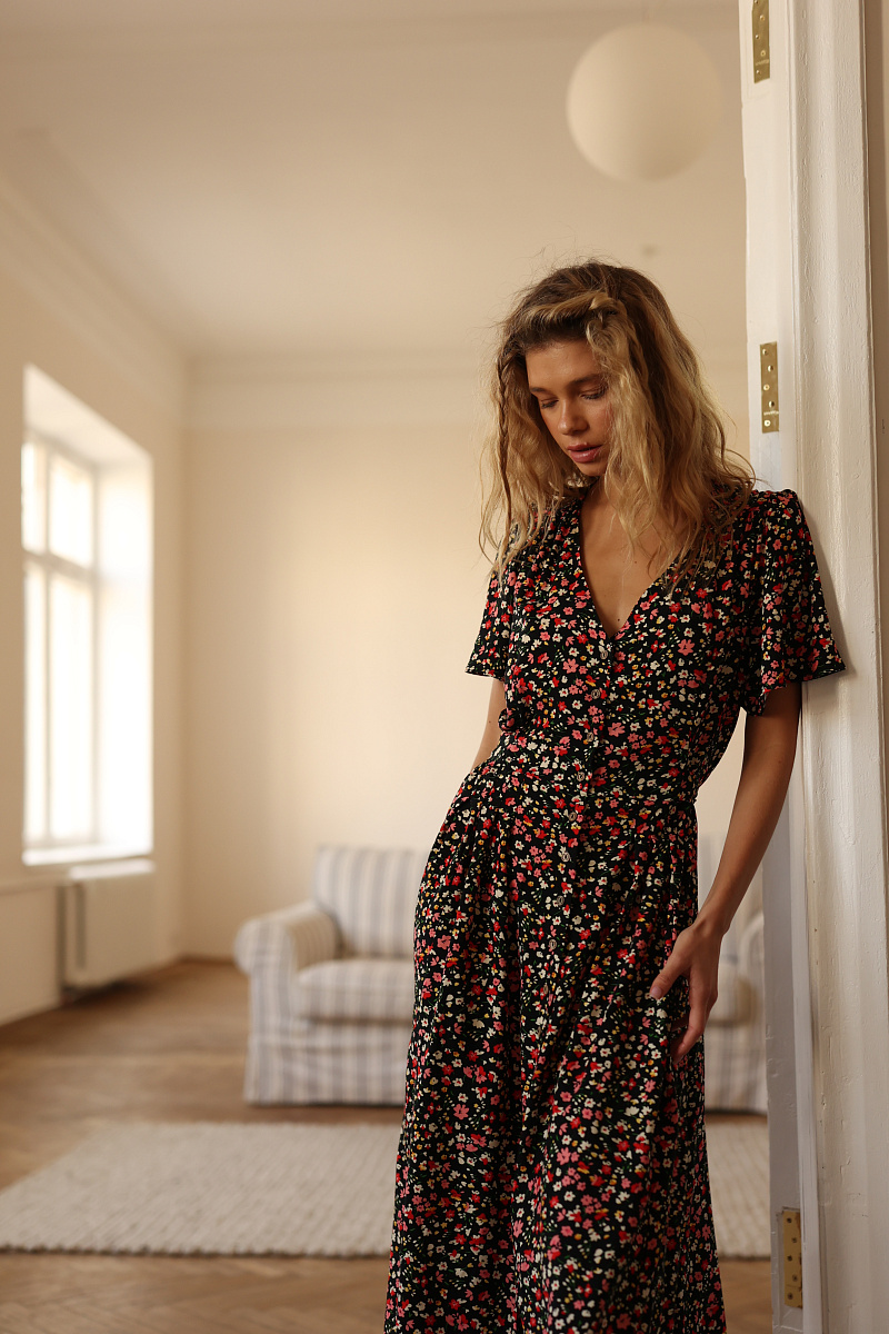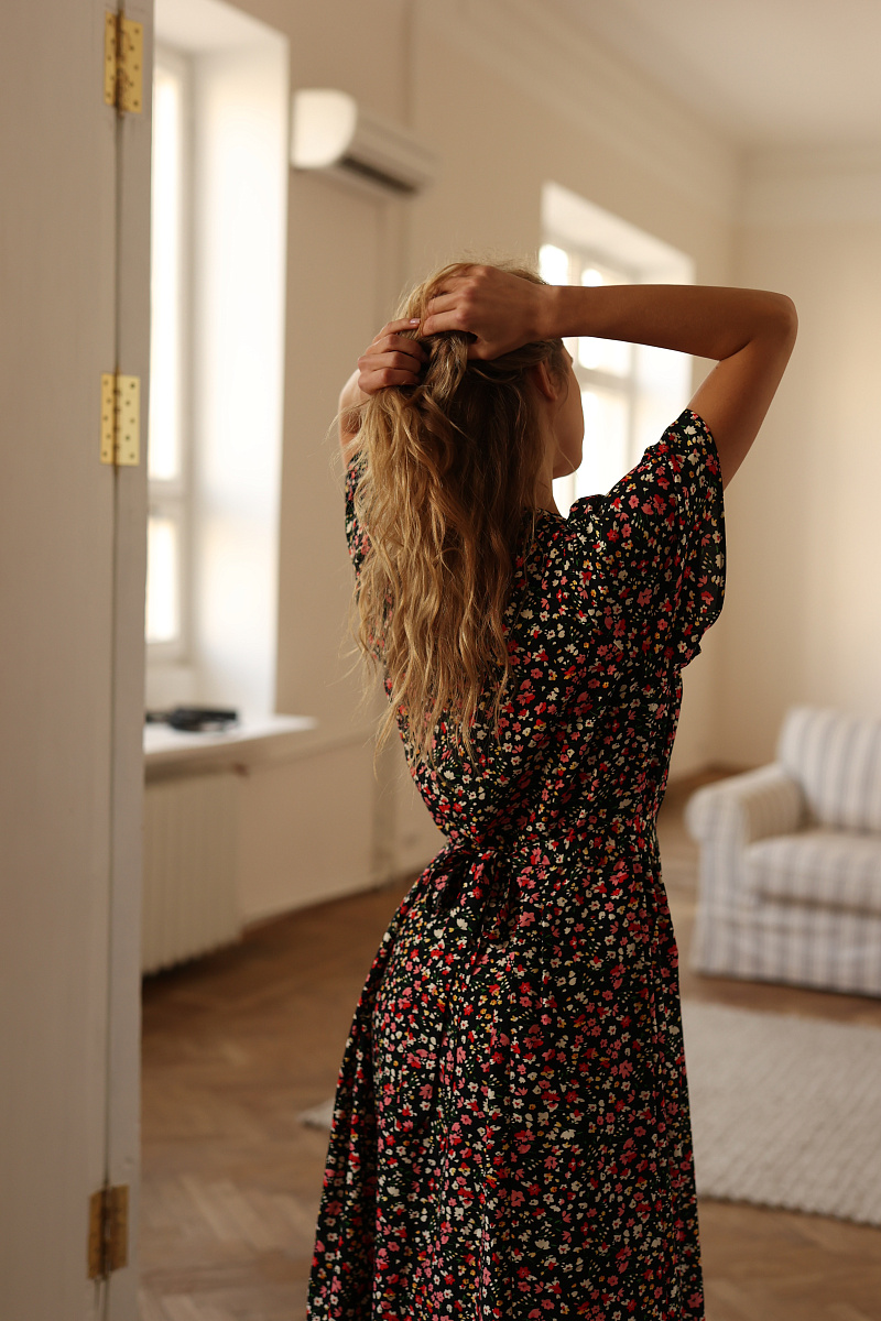 На модели изделие из вискозы Весенние цветы на черном