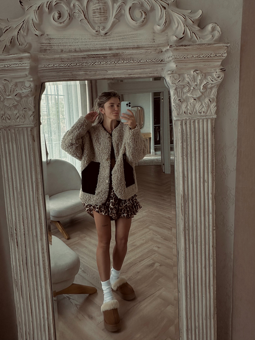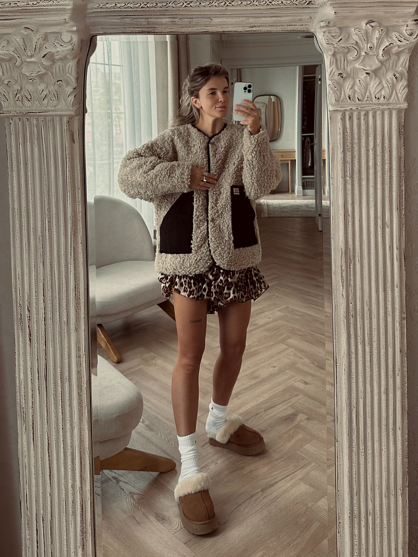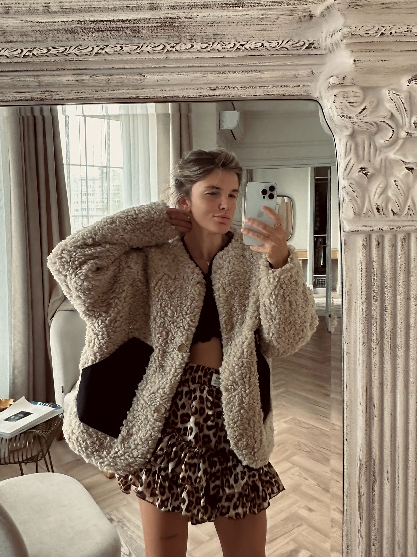 Изделие имеет фасон oversize и спущенный рукав. Цвет изделия на фото Тедди Даст.