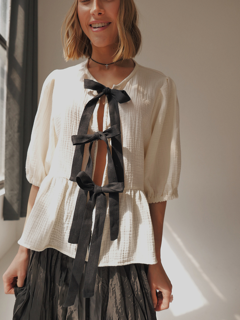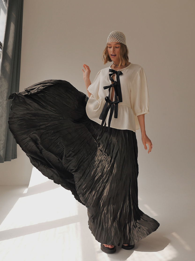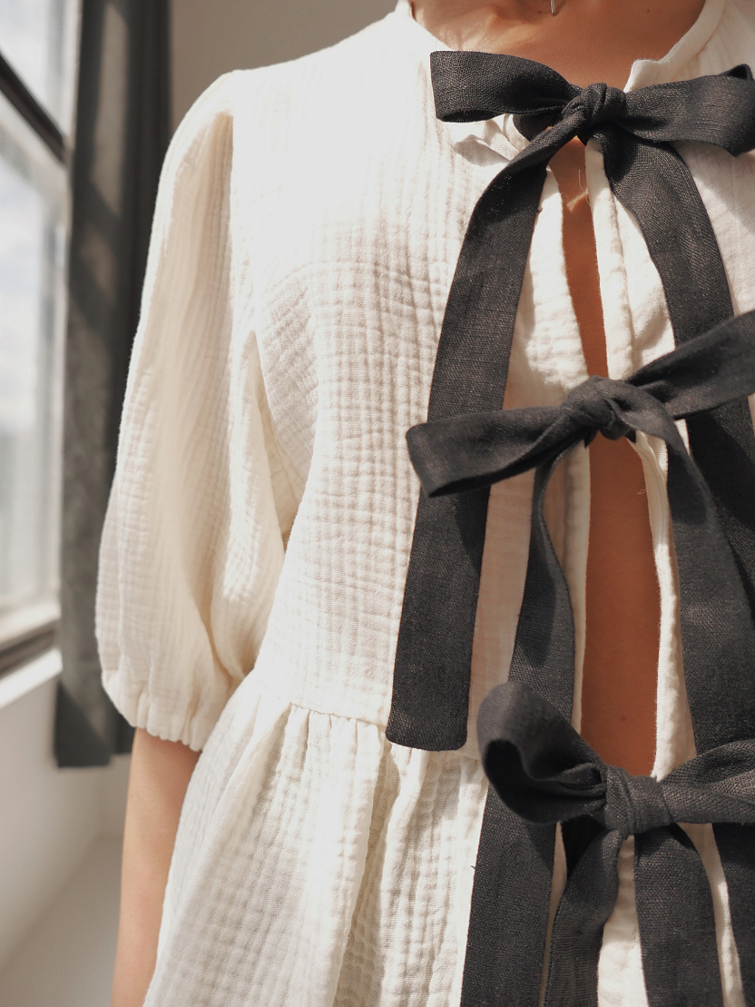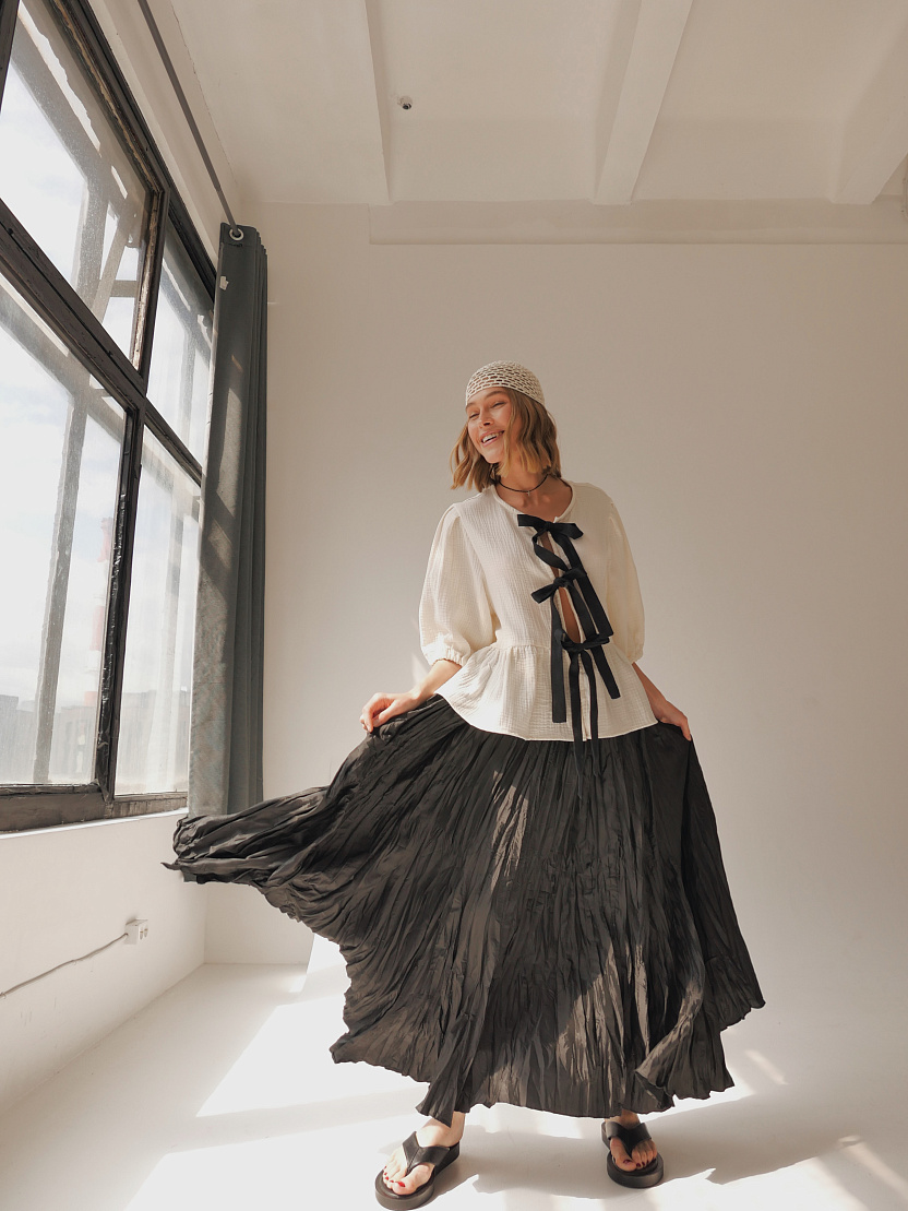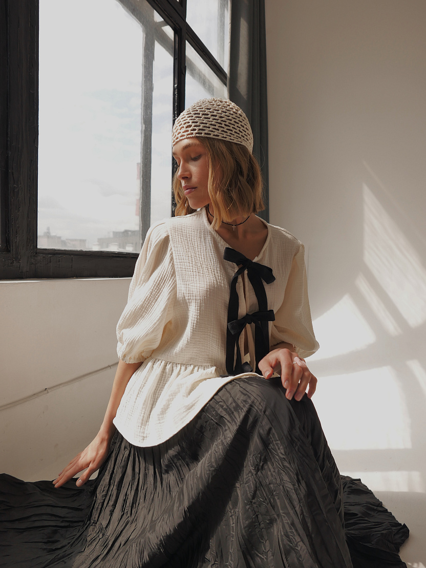 Под заказНа модели изделие из муслина в оттенке сливки.