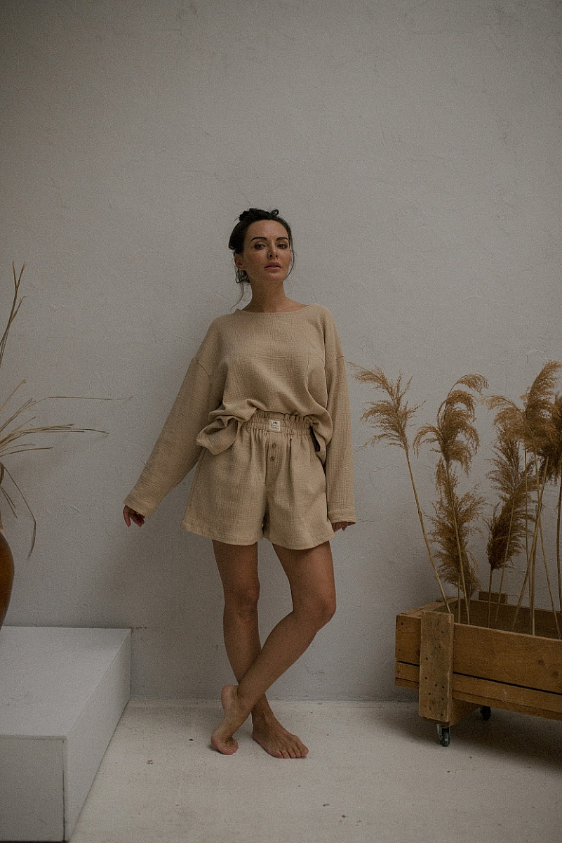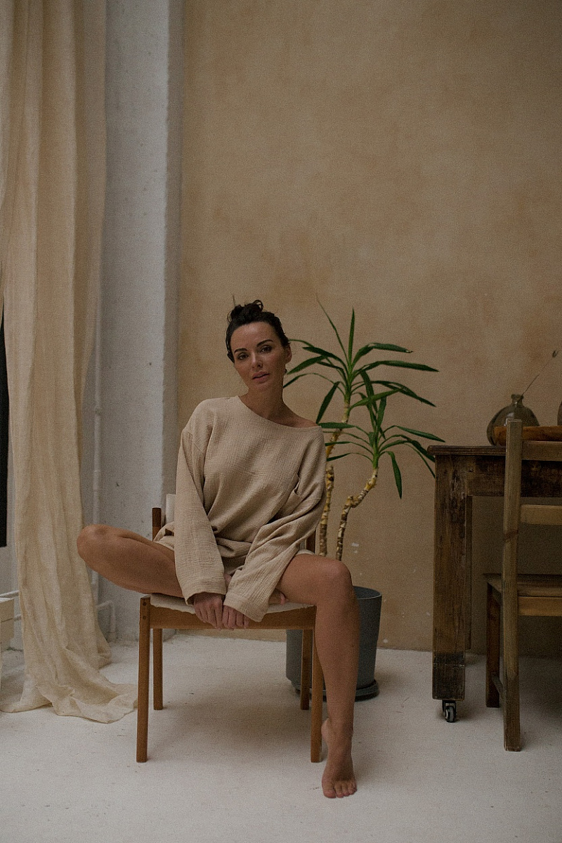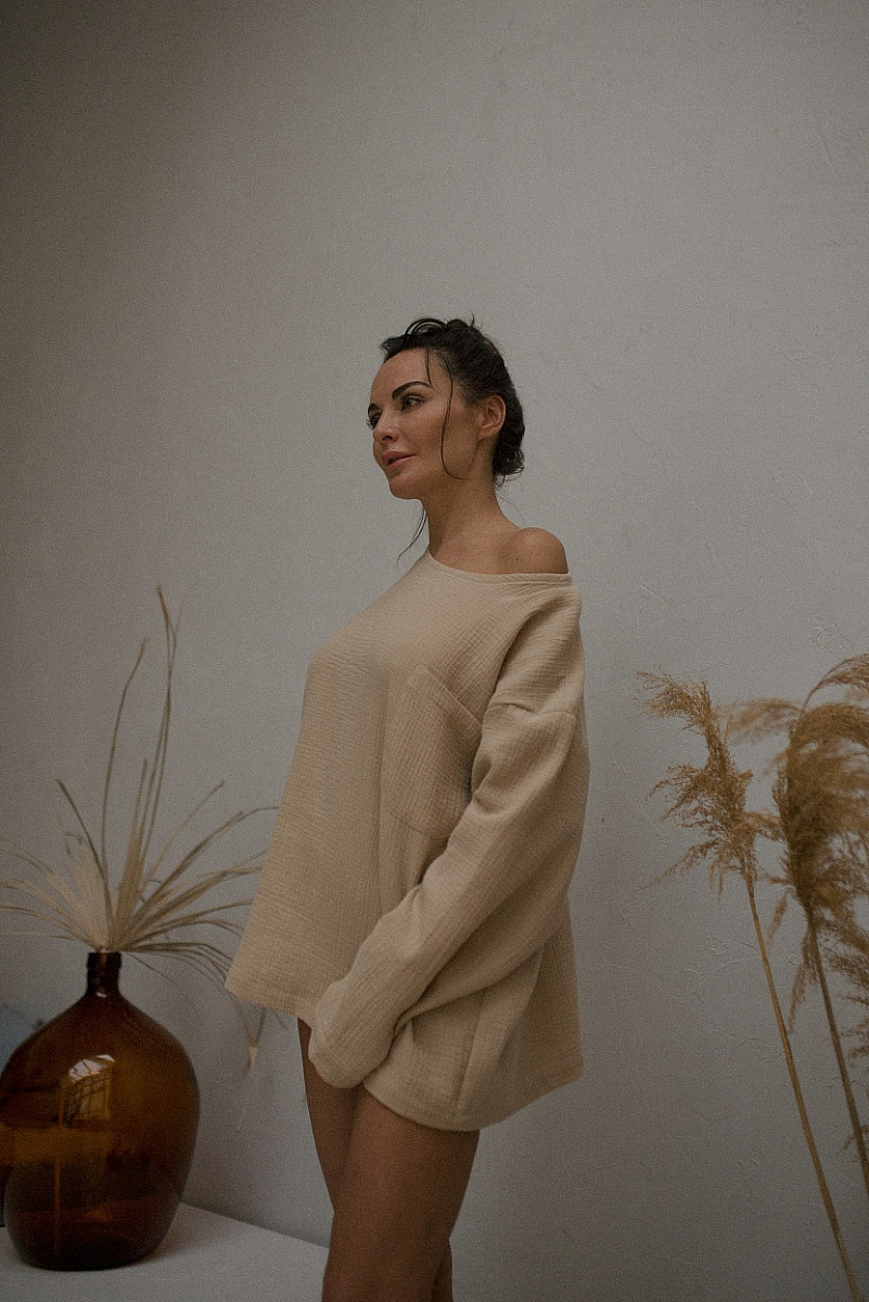Под заказНа модели изделие из муслина в цвете латте. Рост модели 165 см. Изделие имеет фасон оверсайз и спущенный рукав.
