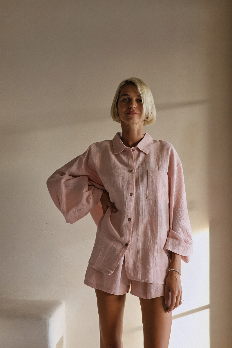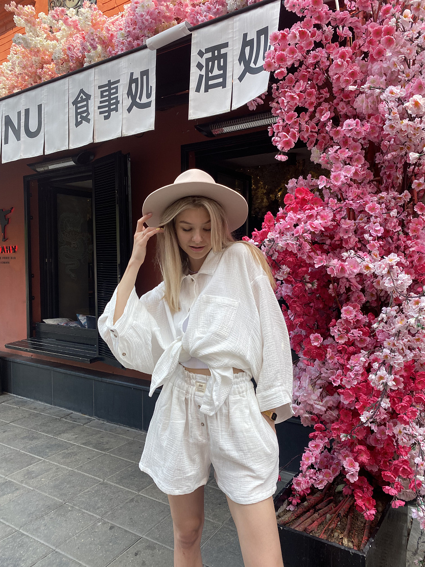На модели изделие из белого льна. Рост модели 172 см. Изделие имеет фасон оверсайз и спущенный рукав.