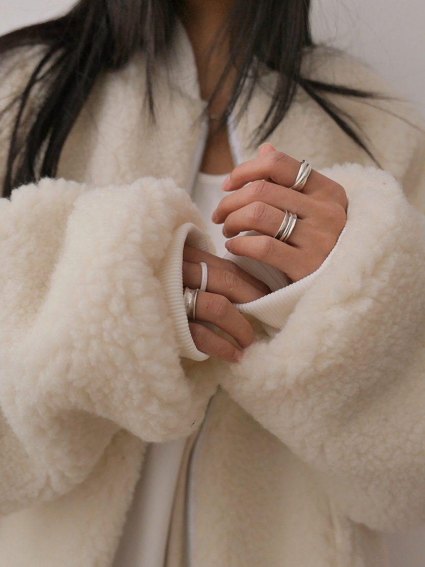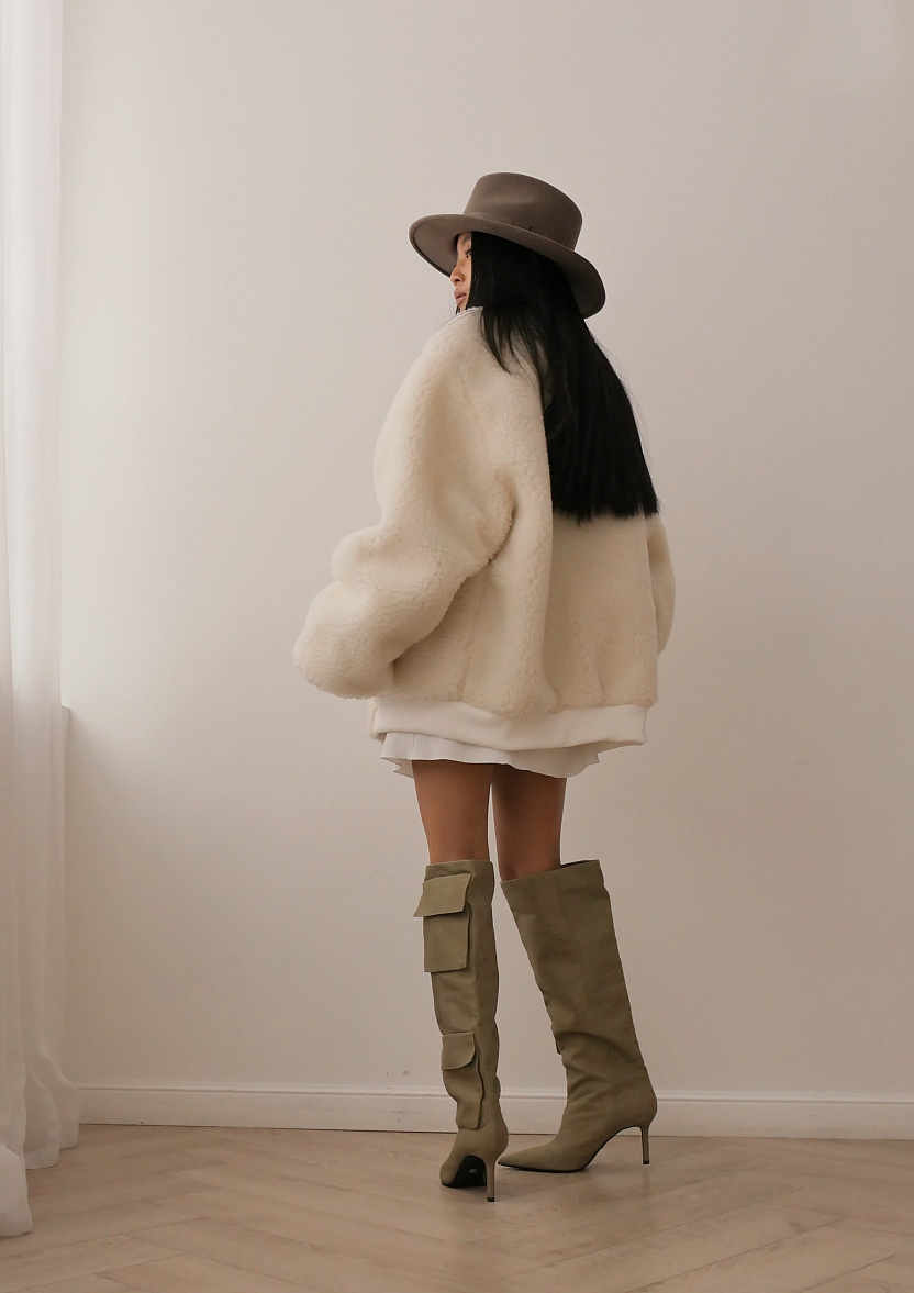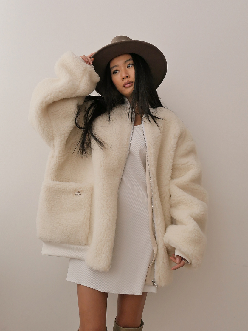 Оверсайз бомбер с овечьей шерстью – натуральный льняной подклад, удобная молния, мягкие манжеты и вместительные карманы.