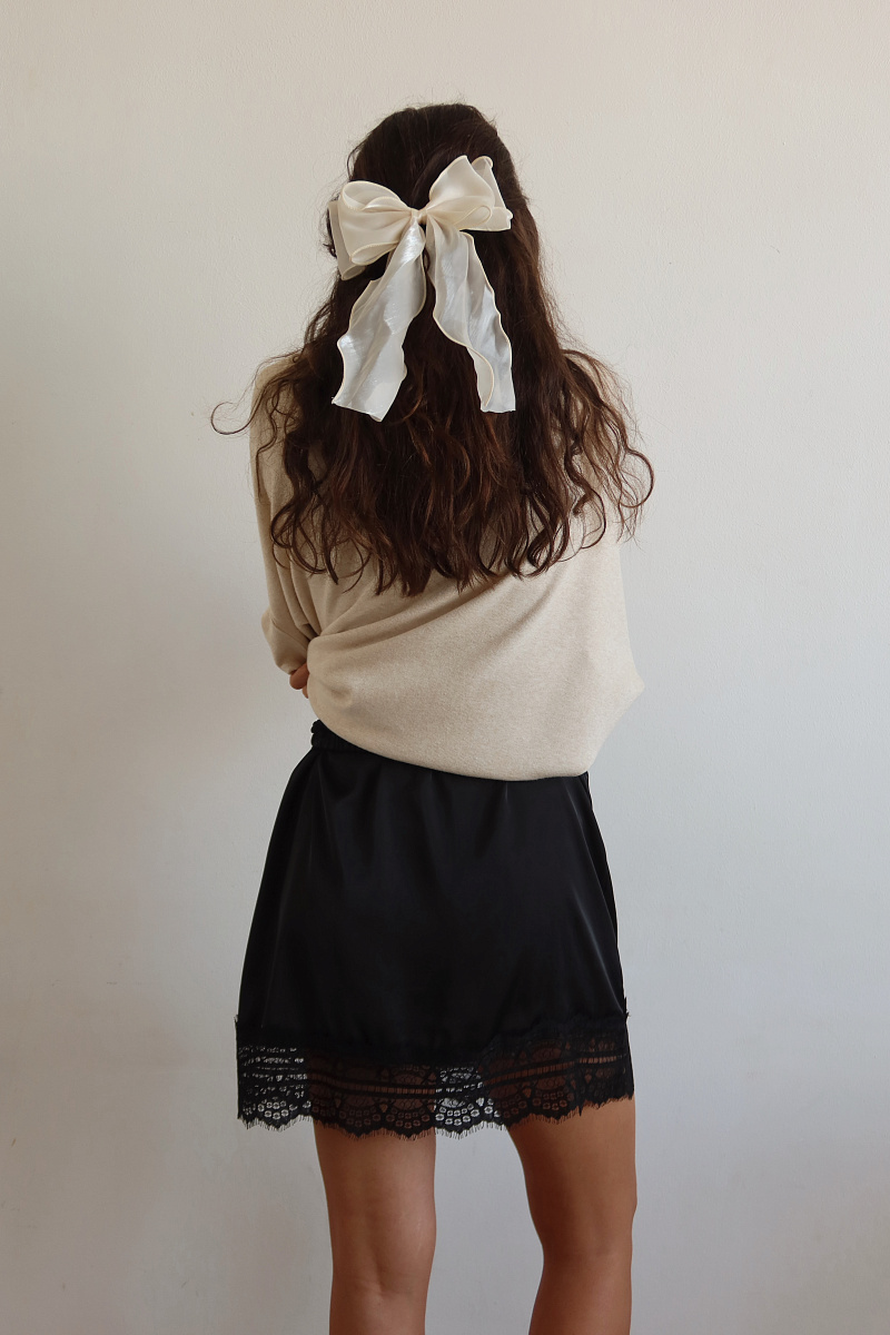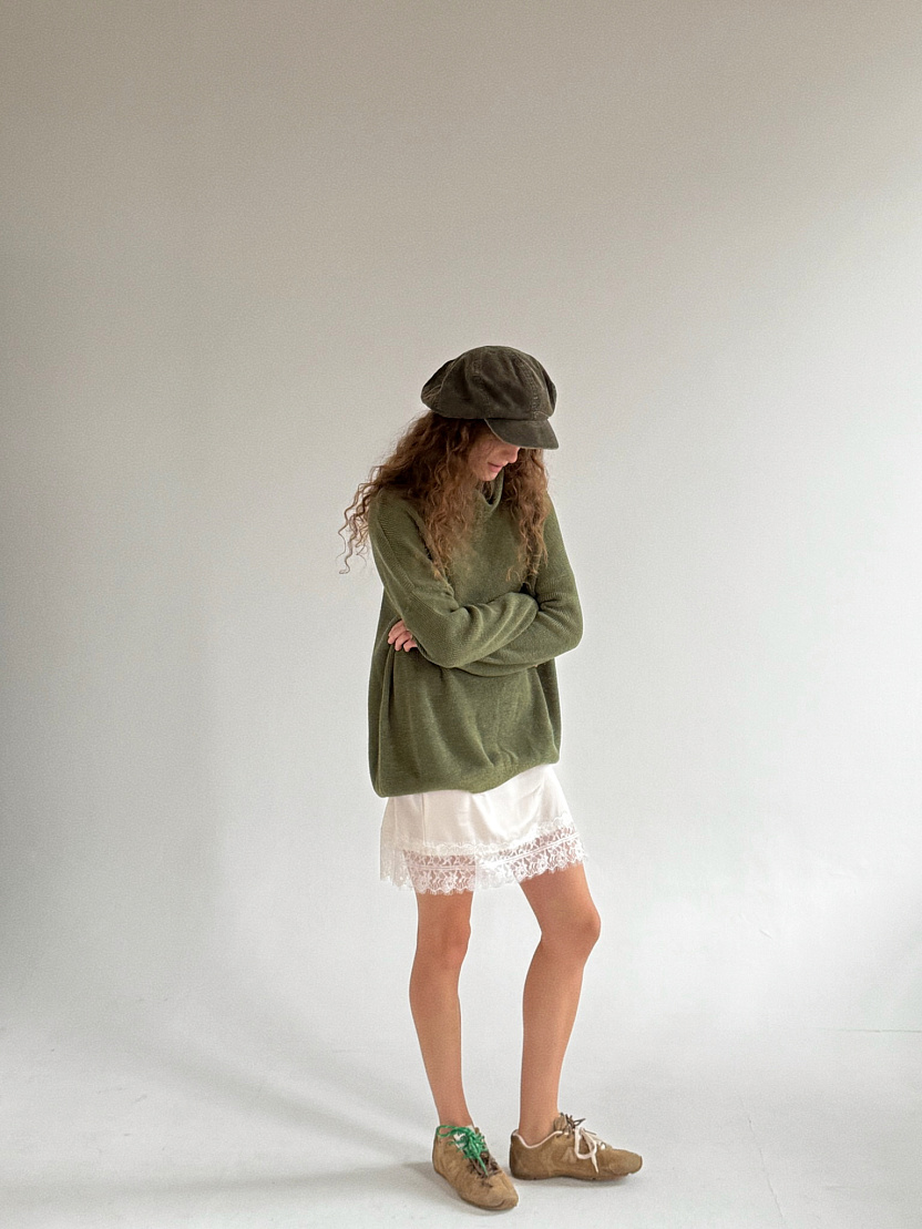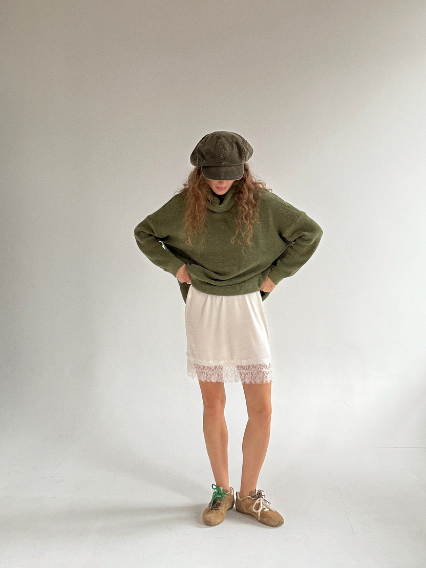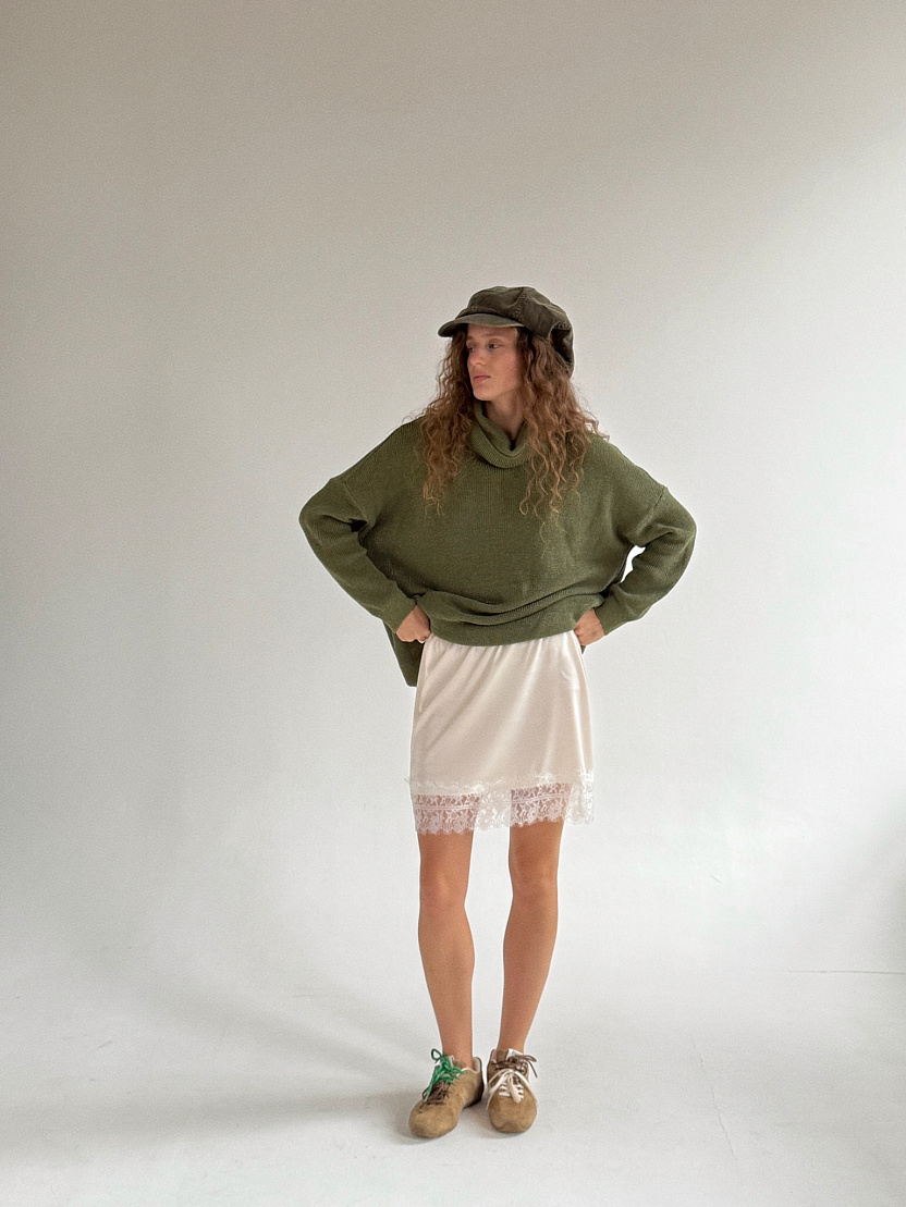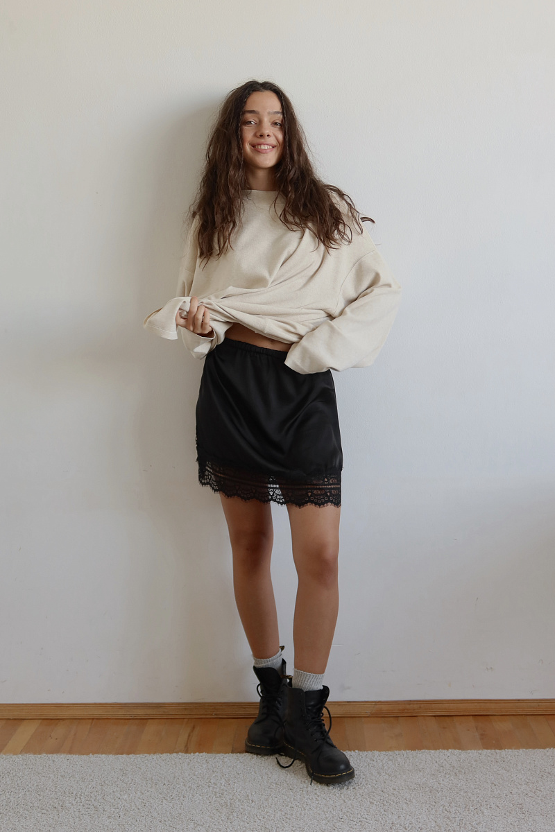Под заказЮбка А-силуэта из шелка с кружевом. На талии мягкая резинка, что позволяет регулировать размер.