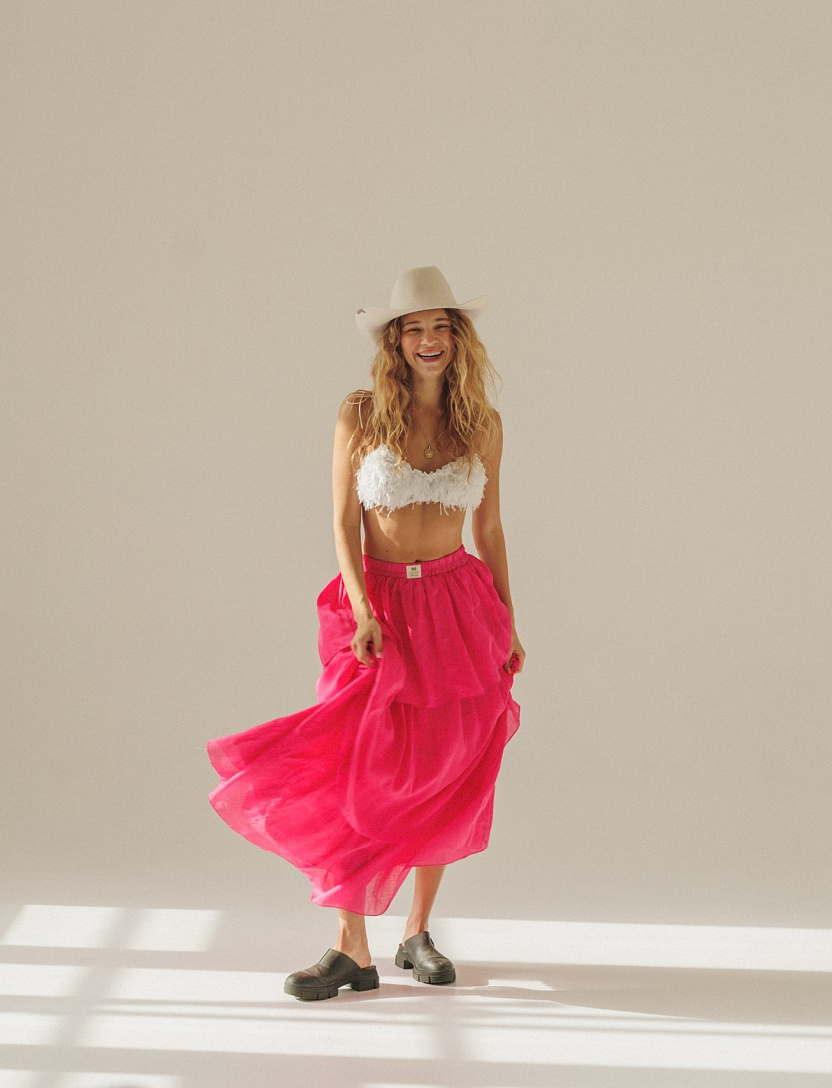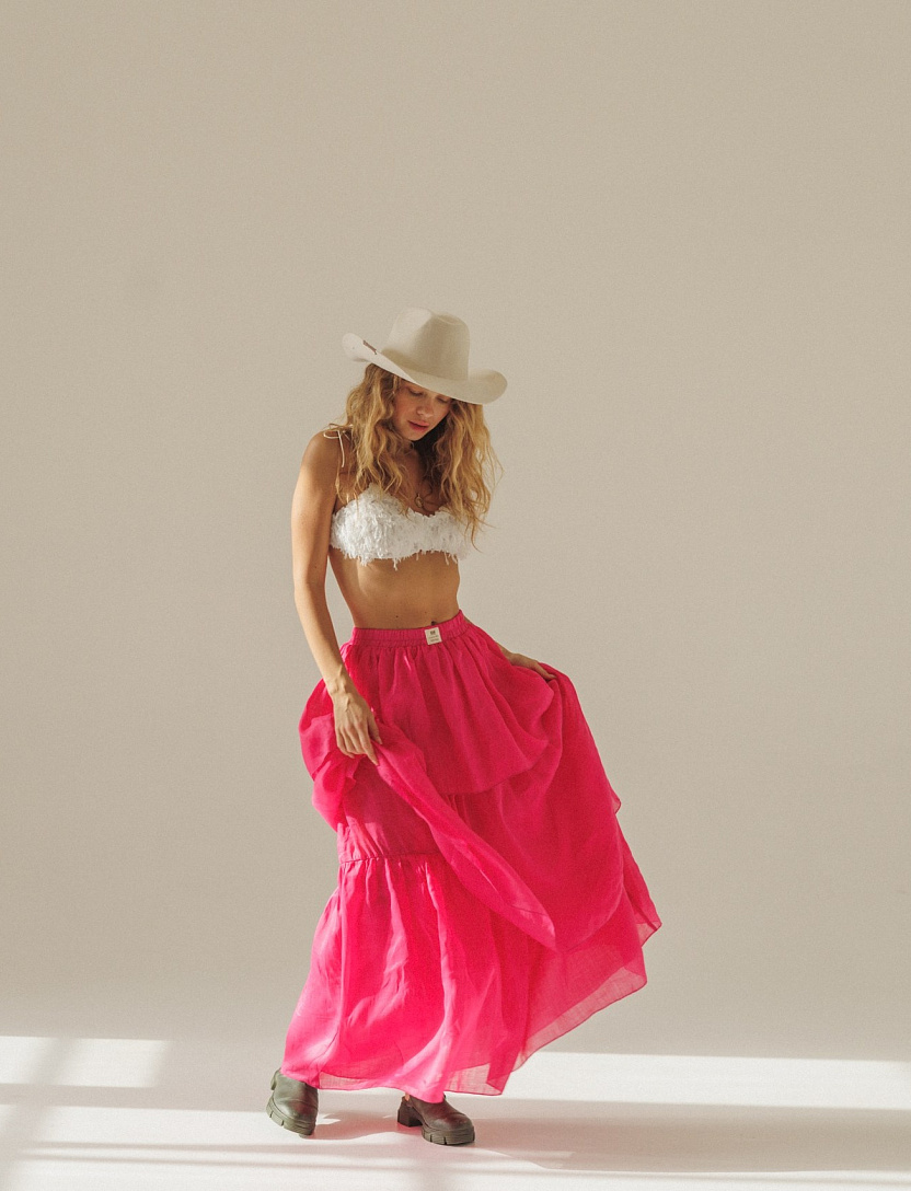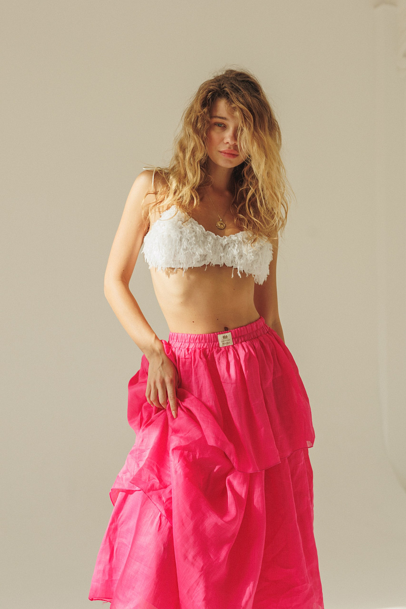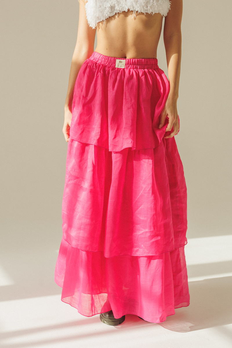 Летящая юбка Фламинго в насыщенном оттенке фуксия с воздушными многоярусными воланами сразу притягивает все взгляды.