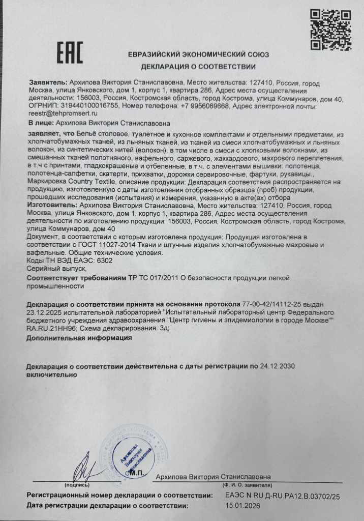 Настоящая политика обработки персональных данных составлена в соответствии с требованиями Федерального закона от 27.07.2006. №152-ФЗ «О персональных данных» и определяет порядок обработки персональных данных и меры по обеспечению безопасности персональных данных ИП Архипова В.С. ( далее- Countrytextile) .